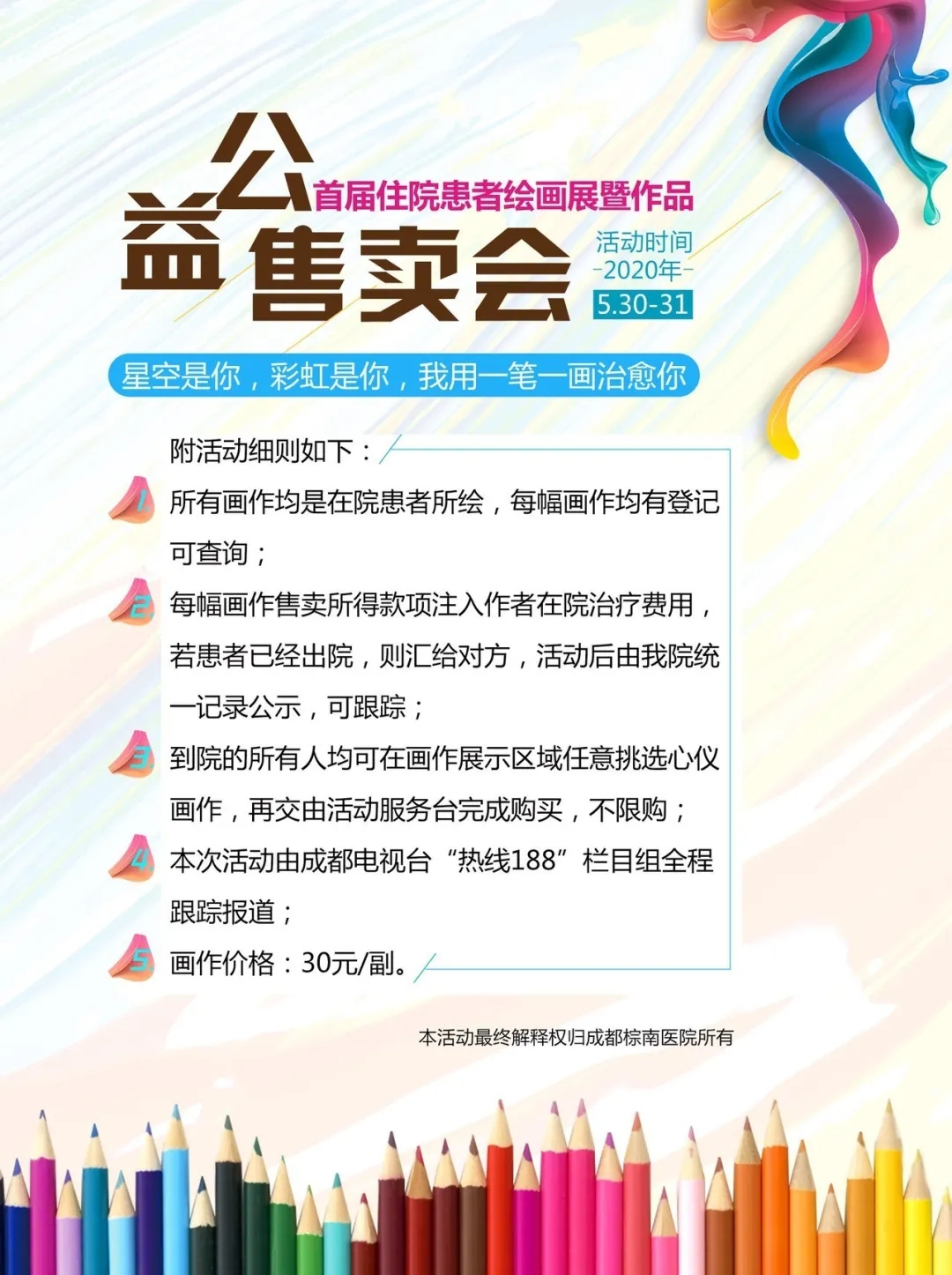 值此6·1儿童节之际,我院联合中科院心理所、成都电视台“热线188”栏目组联合举办“首届住院儿童绘画展暨作品公益售卖会”,画作售卖所有款项将全部用于患者在院治疗费用。让我们拾起童趣、献出爱心,为精神疾病儿童们的康复心路送上祝福!